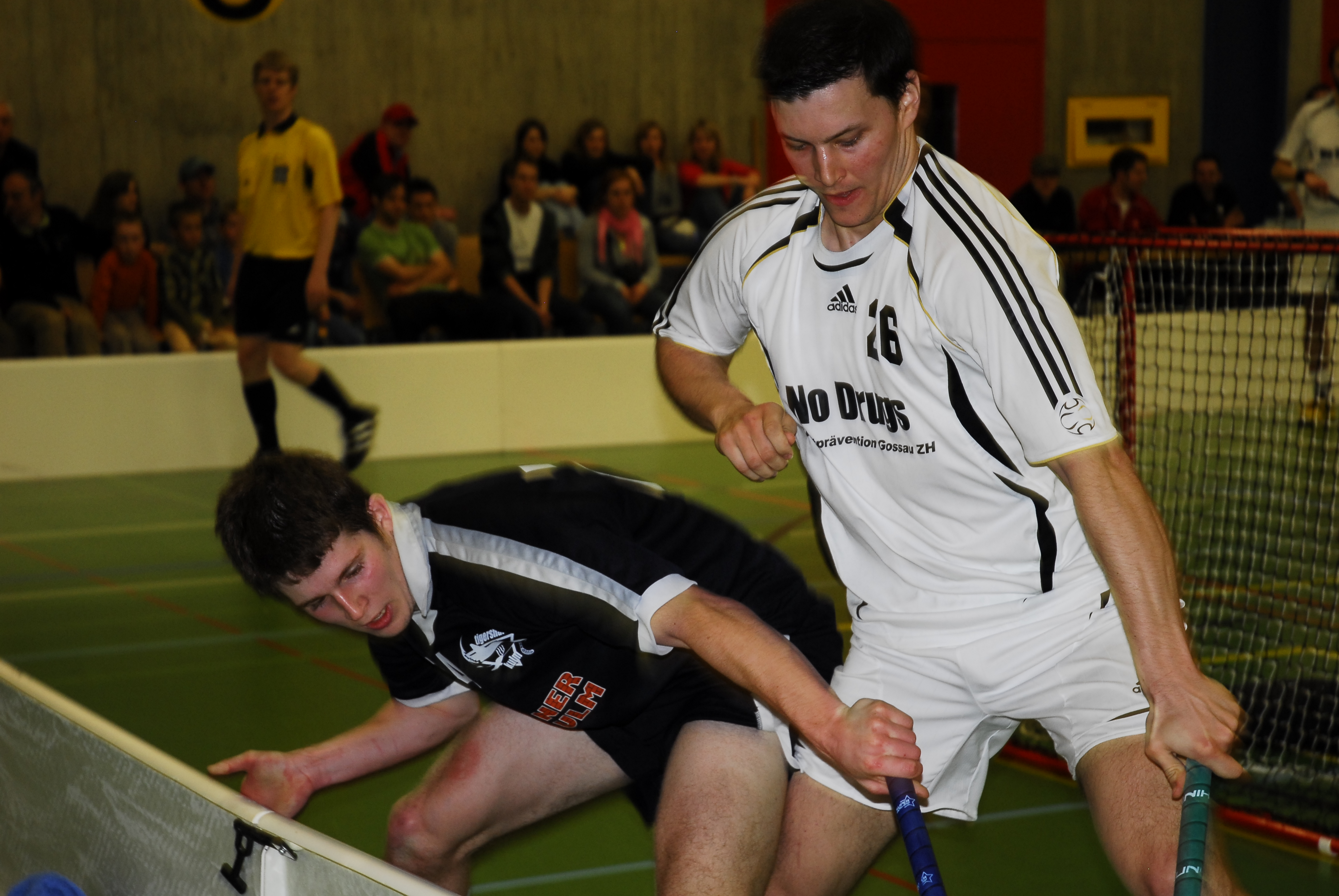 Das Spiel begann so, wie man es sich als eingefleischter Gossauer wünscht: Bevor die Tigersharks auch nur einen einzigen Ball berührten, versenkte Keller auf Pass von Linus Widmer den Ball nach rekordverdächtigen 10 Sekunden zum ersten Mal im gegnerischen Kasten. Wer nun glaubte, dass das der Auftakt zu einem Schaulaufen des Titelverteidigers gewesen wäre, sah sich getäuscht. Die Tiger Sharks stellten sich immer besser auf den Gegner ein und konnten im Powerplay (nach einer dummen Abstandsstrafe) ausgleichen. Darauf dominierten fast zehn Minuten lang beide Defensiven bis dann die angesprochenen fünf glanzvollen Minuten eingeläutet wurden, in denen die Gossauer das Resultat standesgemäss vom 1:1 zum 6:1 schraubten. Mit 6:2 verabschiedete man sich mit einem beruhigenden Polster in die erste Drittelspause.